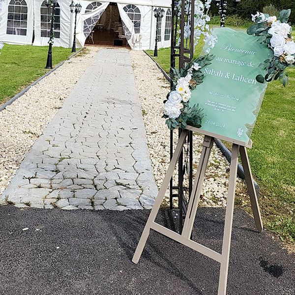 Chevalet en bois élégant et polyvalent, idéal pour accueillir des panneaux personnalisés ou de bienvenue lors d’événements, compatible avec des panneaux de 40×60 cm à 100×150 cm.